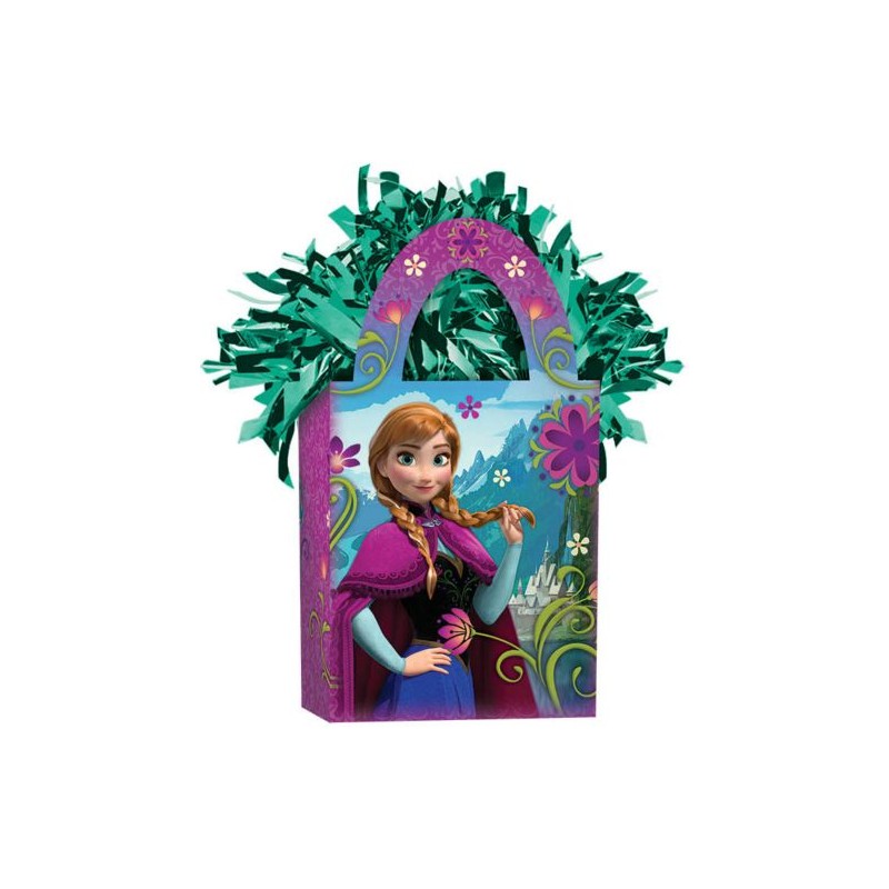 Let Anna hold down your balloons! The Frozen 5.7oz Balloon Weight (Each) is shaped like a small gift bag and features a colorful image of Anna from Disney's Frozen. Anna has her hair in two braids, wears a blue skirt and purple cape and stands against a backdrop of a castle and mountains.